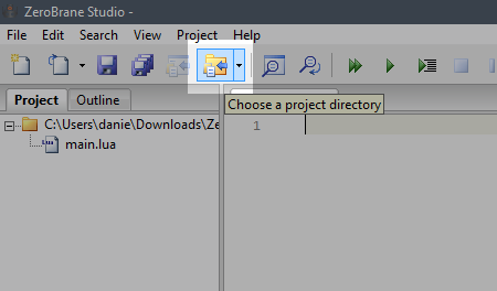Now we need to make a Project Folder. Open you file explorer and create a folder wherever you like, and name it whatever you want. In ZeroBrane Studio, click on the "Select Project Folder" icon, and select the folder you just created.