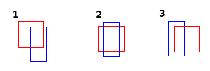 Take a look at the positions of the rectangles. In the first example, Red is not colliding with Blue, because Red is too far to the left. If Red was a bit further to the right, they would touch. How far exactly? Well, if Red's right side is further to the right than Blue's left side. This is something that is true for example 3.